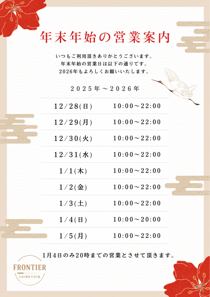 年末年始営業日について —東広島市 鍼灸院フロンティア— 2025年12月29日 最終更新日時 : 2025年12月29日 haramoto こんにちは!東広島市西条にある鍼灸院フロンティアです! 年末年始の営業日については下記の通りになりますのでよろしくお願い致します。
